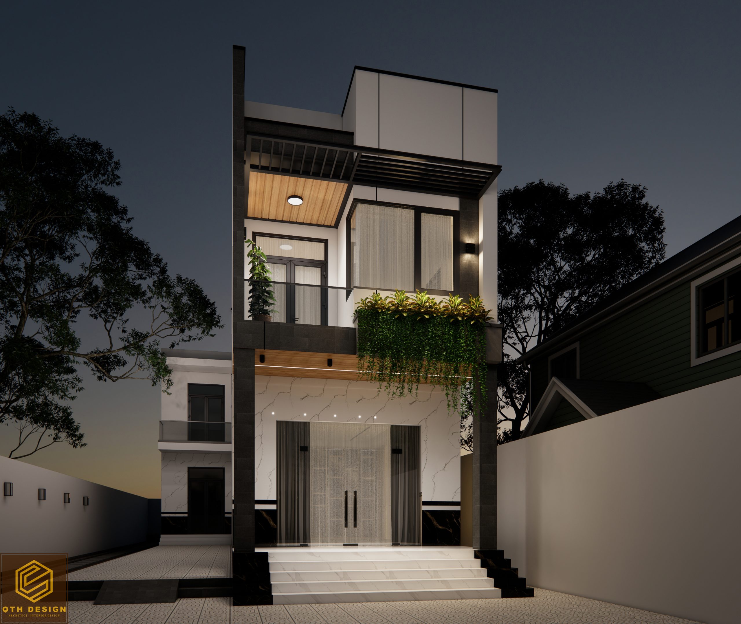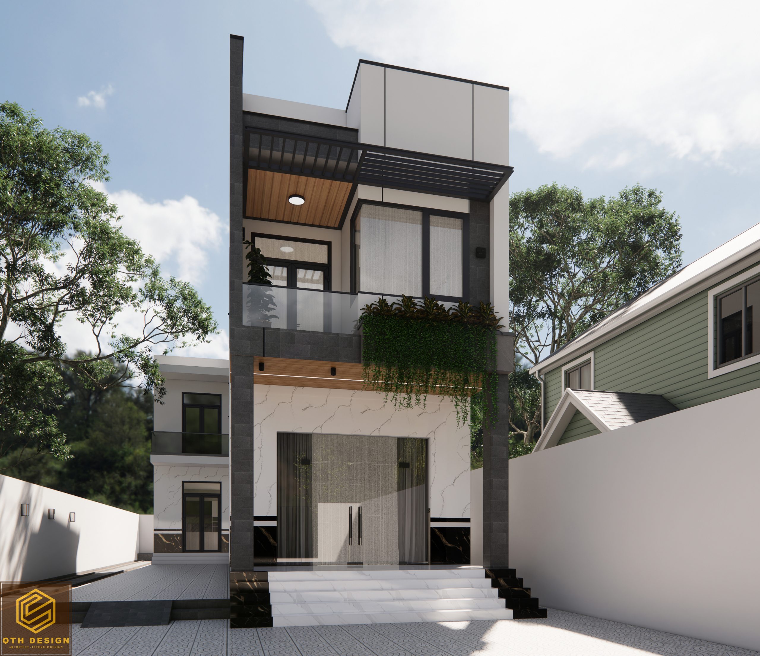 • Vật liệu: Mặt tiền sử dụng đá ốp màu đen và xám than làm điểm nhấn ở phần chân tường và các cột trụ. Kính cường lực trong suốt được sử dụng cho lan can tầng 2, giúp không gian mở rộng thị giác và tăng tính hiện đại.