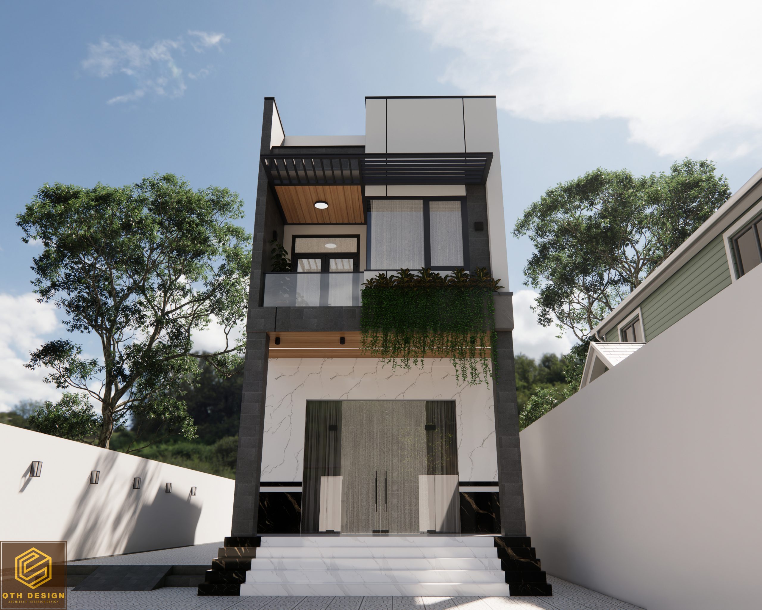 Mặt tiền ngôi nhà được thiết kế với bố cục hình khối rõ ràng, dứt khoát – đặc trưng của kiến trúc hiện đại. Hệ cột vuông vức kết hợp với các mảng tường phẳng, không sử dụng quá nhiều chi tiết trang trí, tạo nên sự tinh tế và khỏe khoắn. Công trình sử dụng màu sắc trung tính như trắng, đen và xám làm chủ đạo, giúp tổng thể trở nên thanh lịch và dễ dàng hài hòa với cảnh quan xung quanh.
