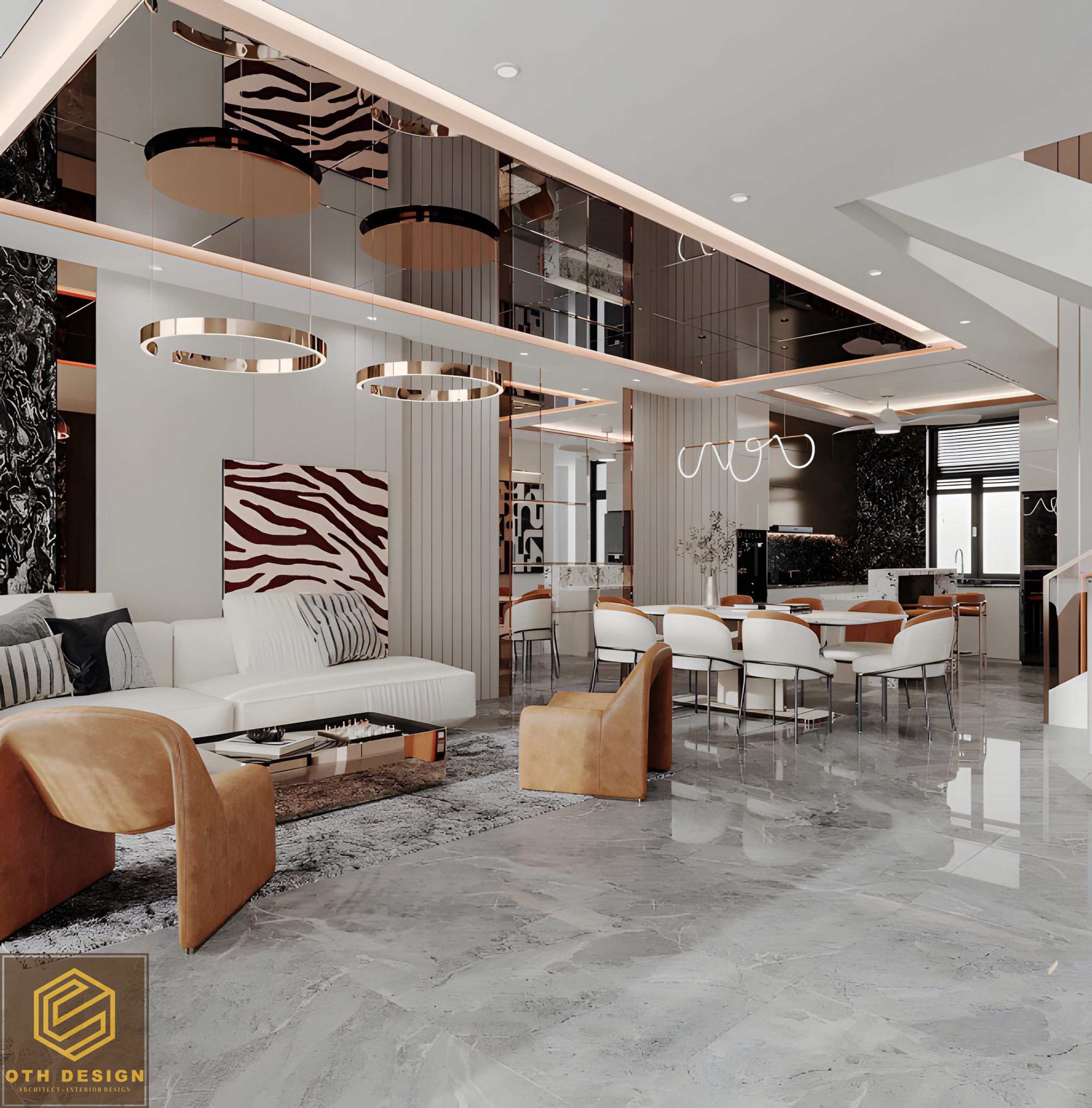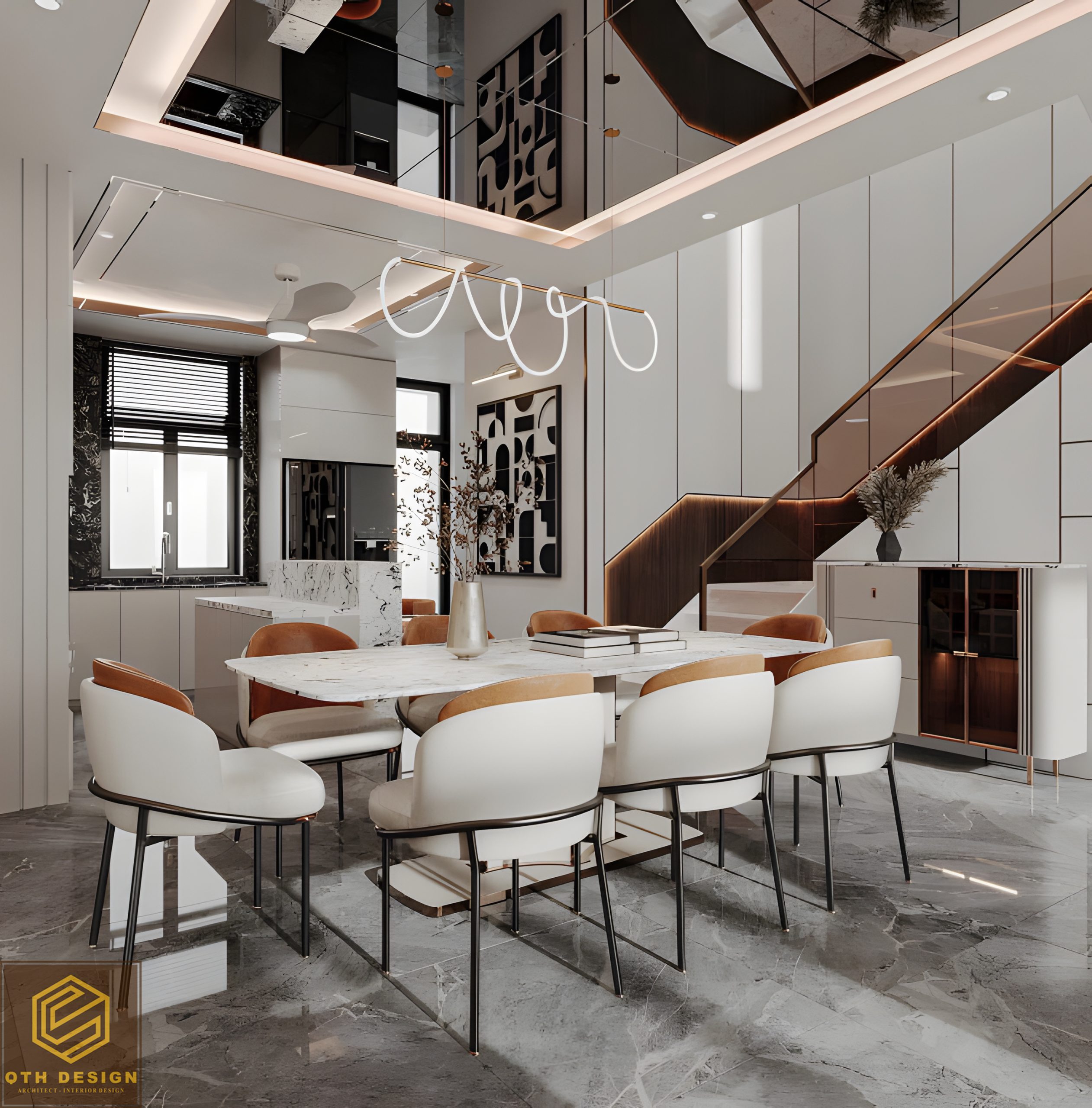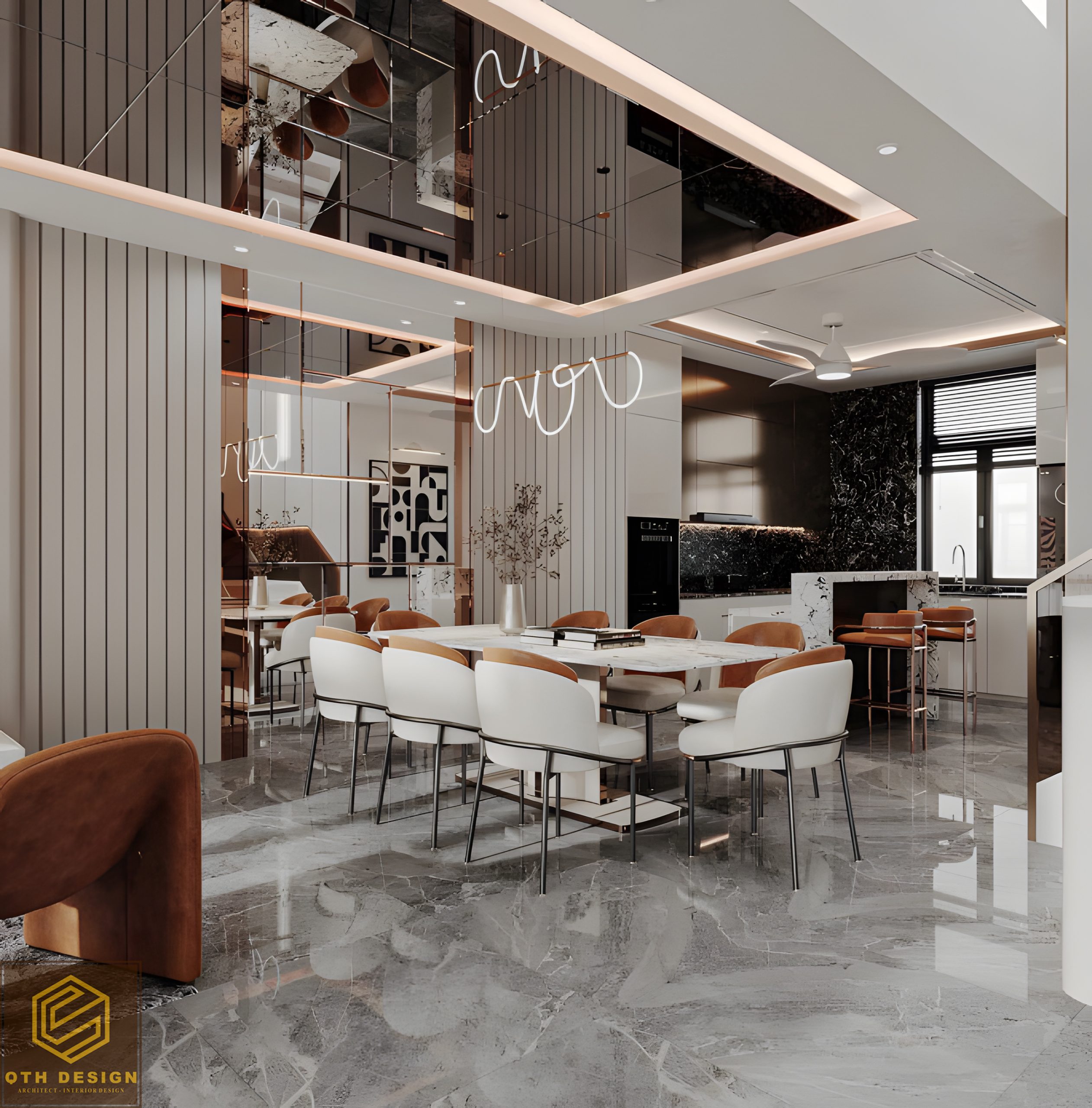 Nội thất tầng trệt áp dụng thiết kế không gian mở, kết nối liền mạch giữa phòng khách, bàn ăn và bếp. Vật liệu đá marble xám bóng gương cùng các mảng tường ốp gỗ tạo cảm giác sang trọng. Hệ đèn trần nghệ thuật, đặc biệt là các đường LED chạy âm trần, vừa tăng tính thẩm mỹ vừa mang lại ánh sáng ấm áp. Ghế ăn bọc nệm phối da màu nâu mang lại sự êm ái và đồng điệu với ghế lounge trong phòng khách.
