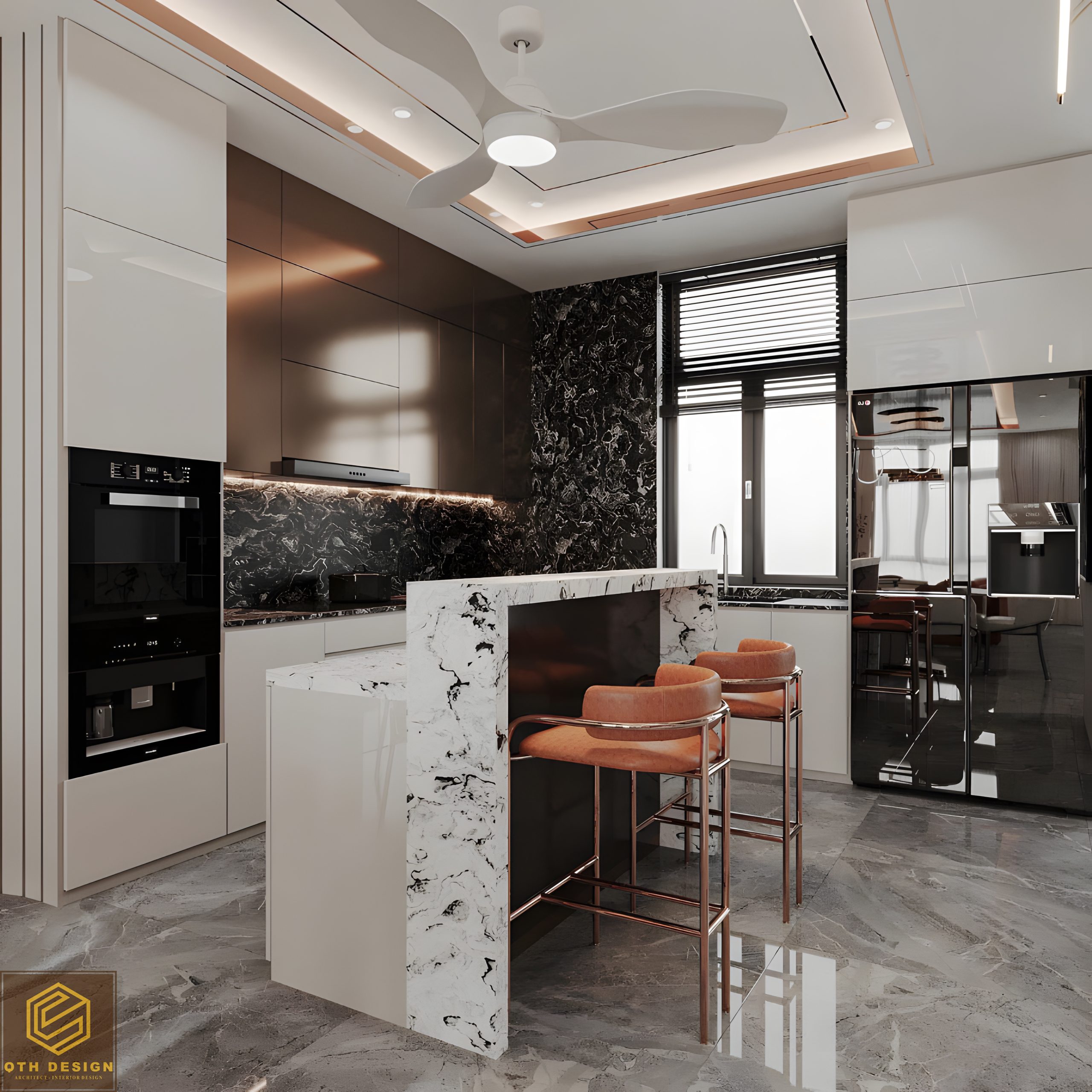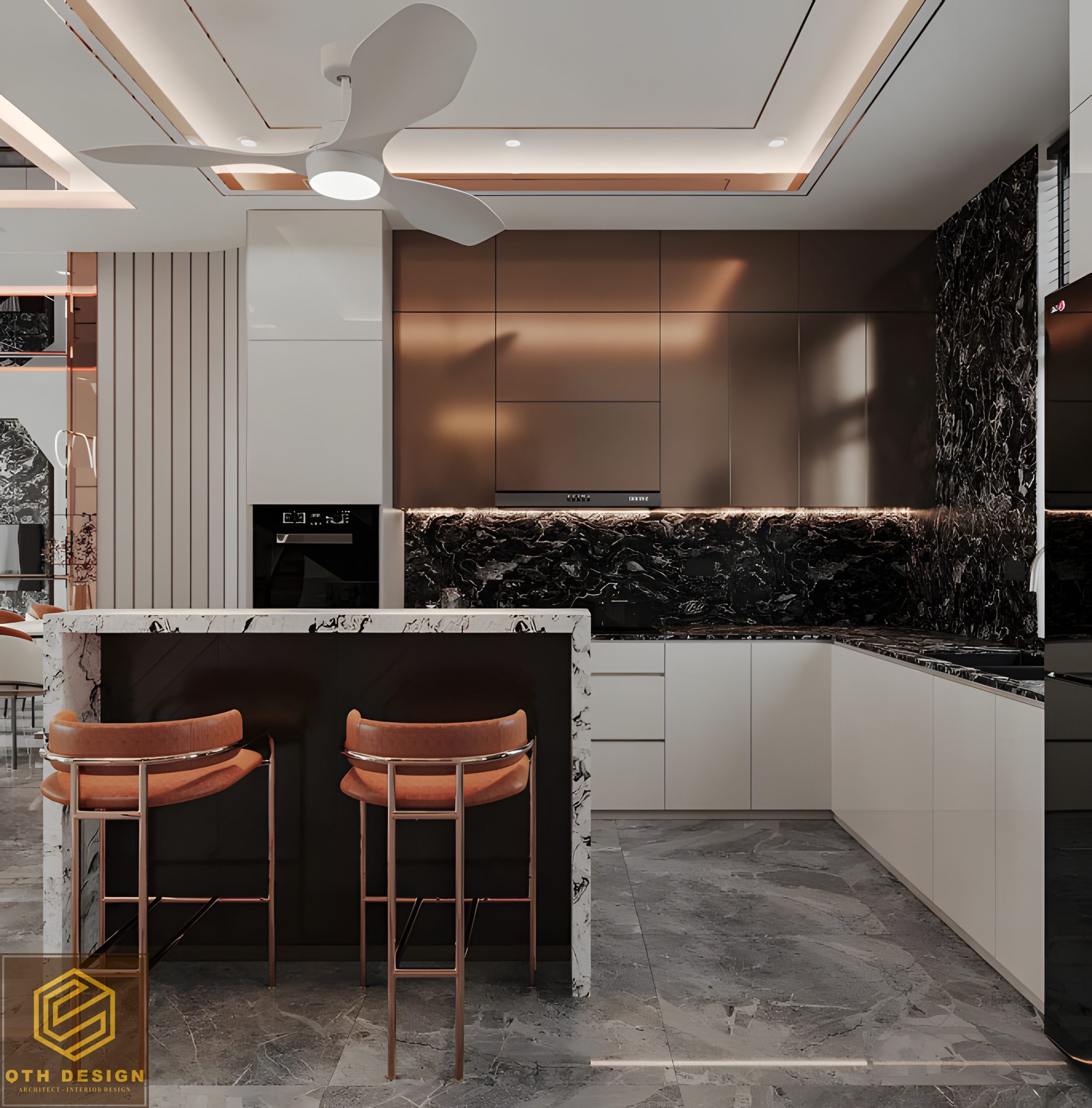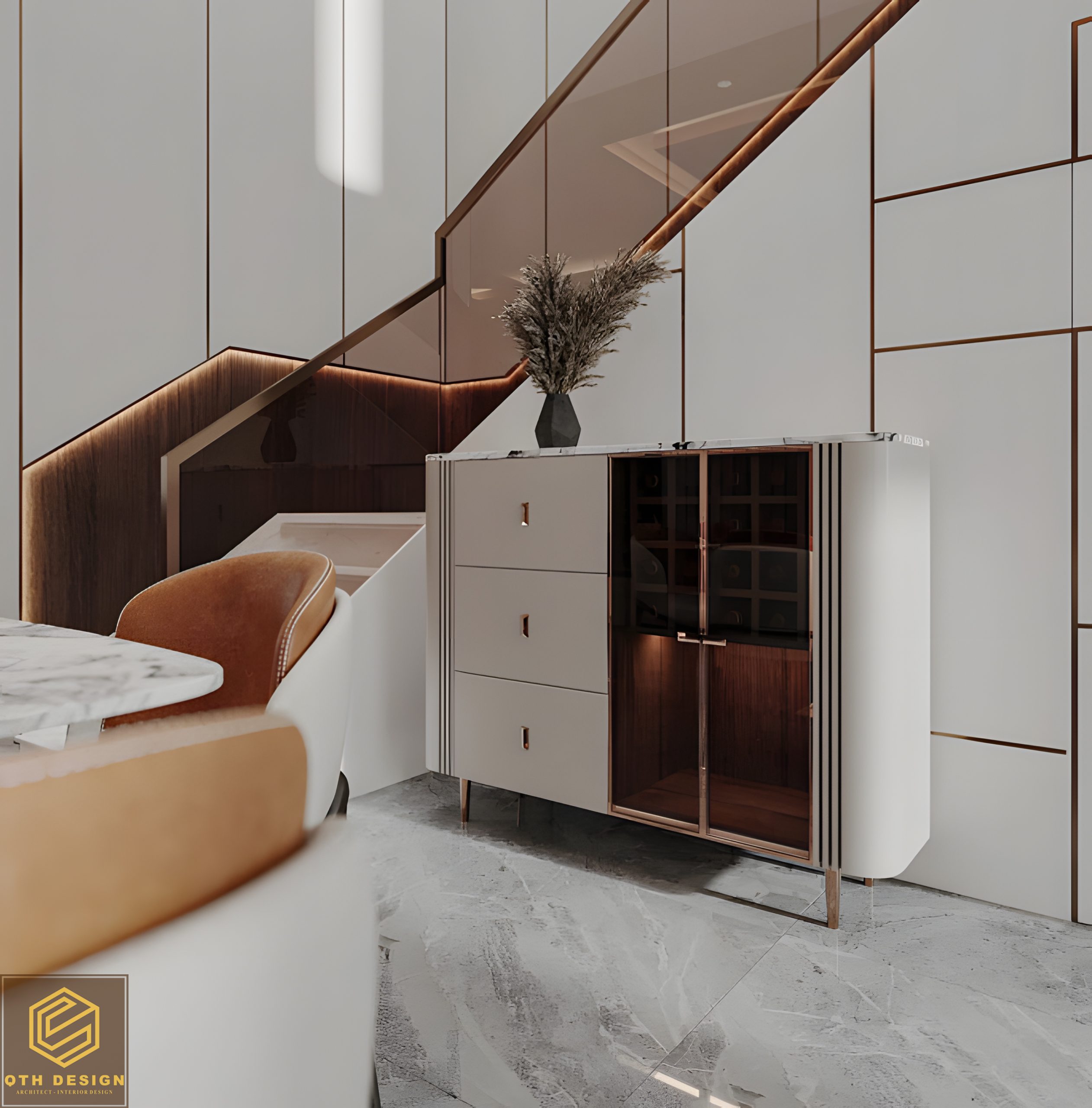 Nội thất tầng trệt áp dụng thiết kế không gian mở, kết nối liền mạch giữa phòng khách, bàn ăn và bếp. Vật liệu đá marble xám bóng gương cùng các mảng tường ốp gỗ tạo cảm giác sang trọng. Hệ đèn trần nghệ thuật, đặc biệt là các đường LED chạy âm trần, vừa tăng tính thẩm mỹ vừa mang lại ánh sáng ấm áp. Ghế ăn bọc nệm phối da màu nâu mang lại sự êm ái và đồng điệu với ghế lounge trong phòng khách.