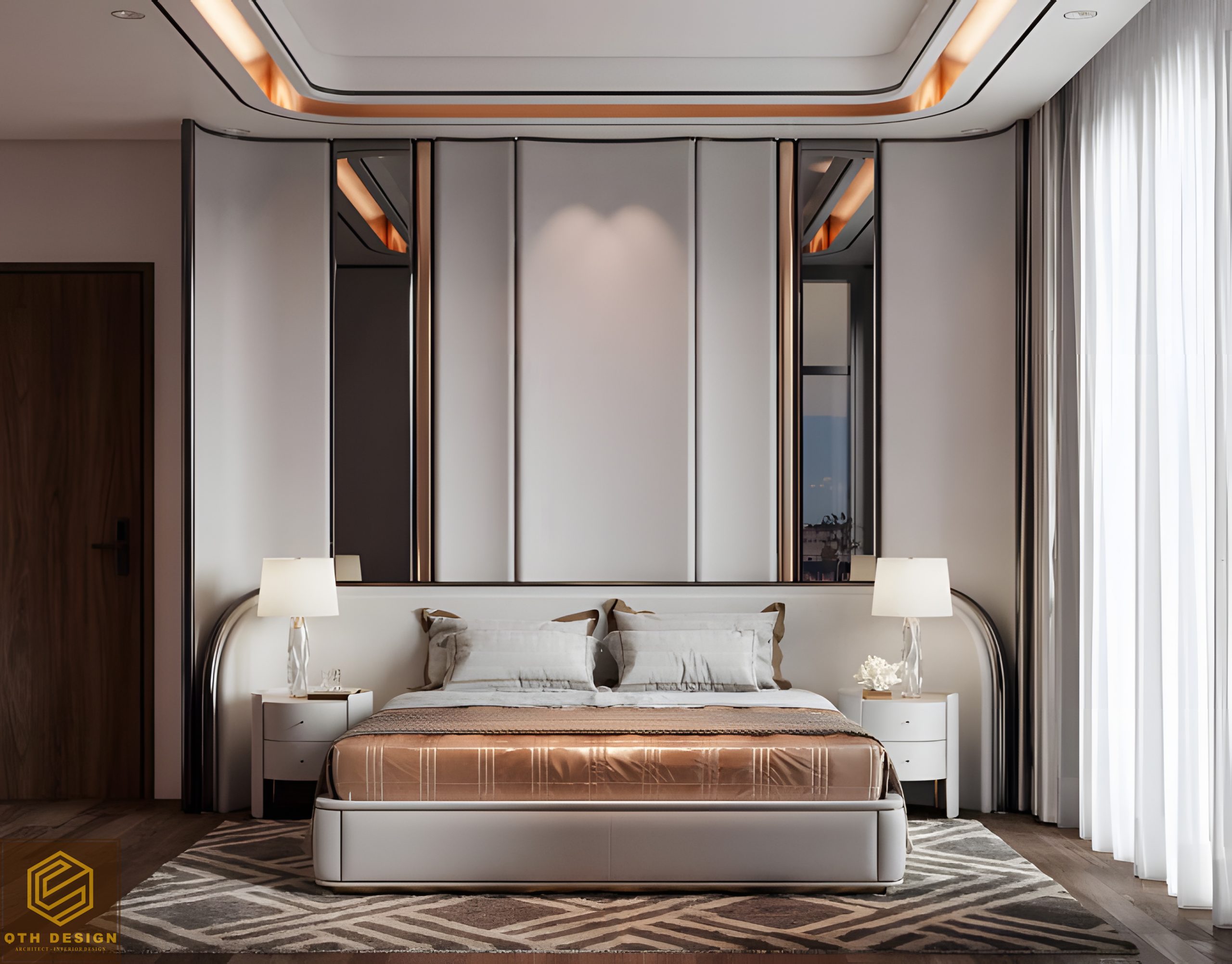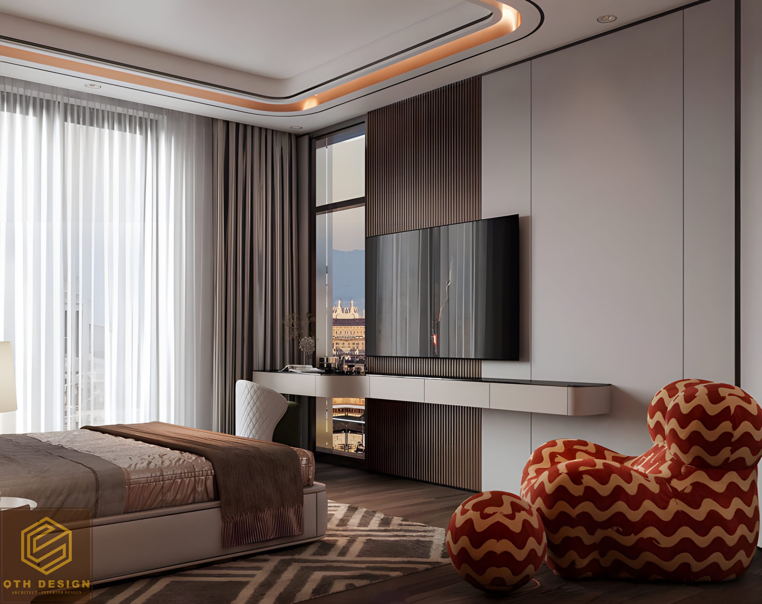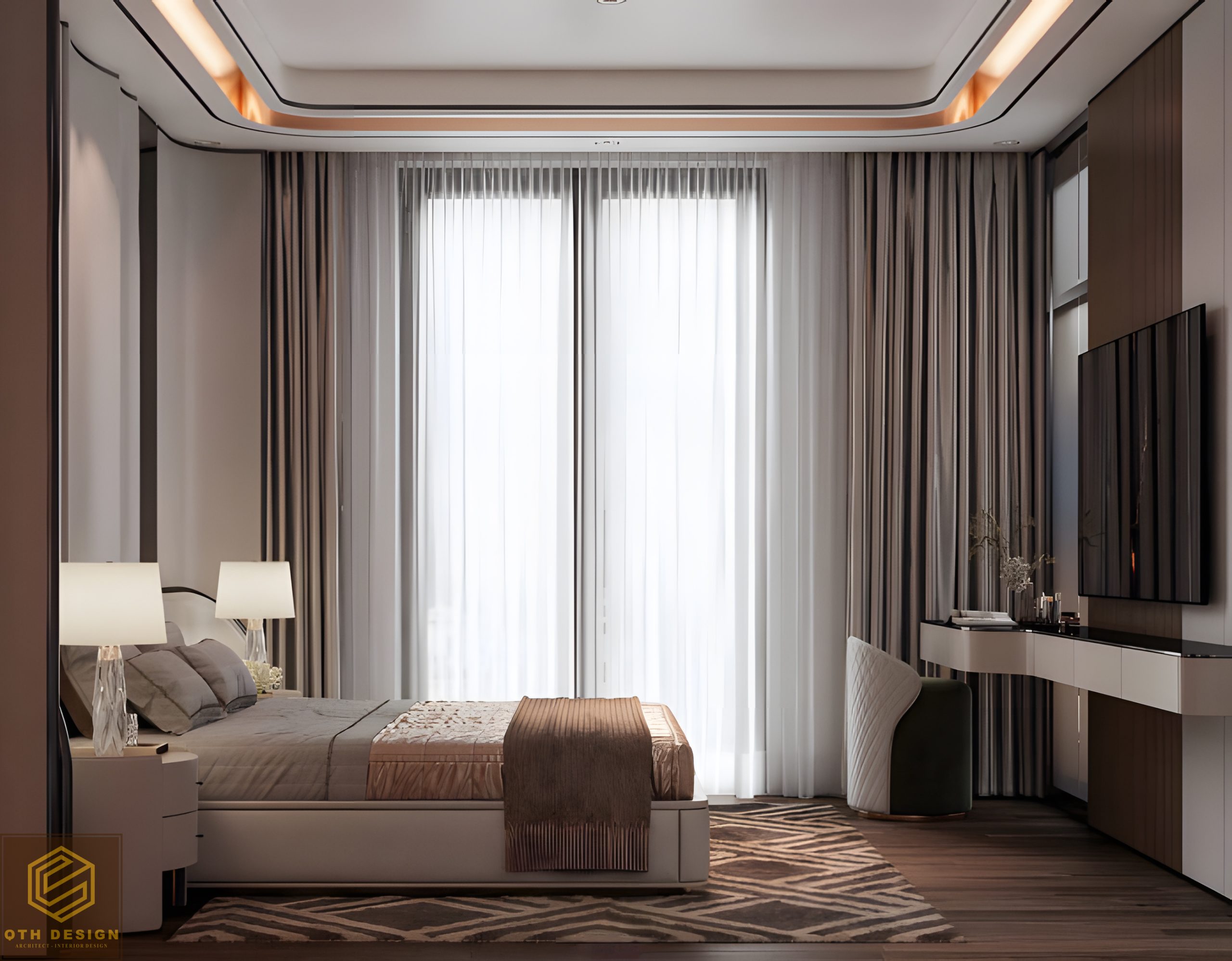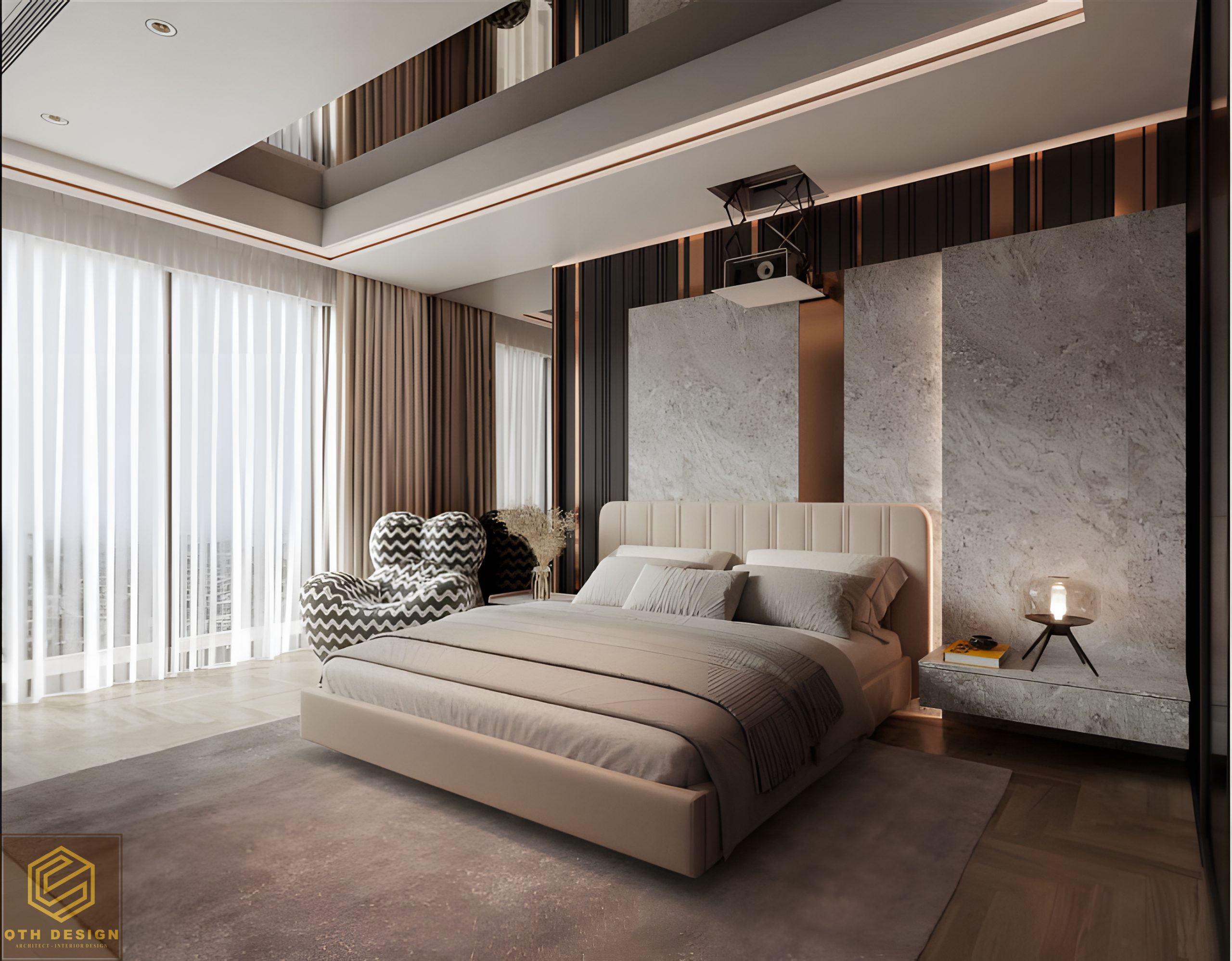 Các phòng ngủ ưu tiên sự tối giản trong đường nét, với gam màu trung tính (xám, be, nâu) làm chủ đạo. Rèm cửa hai lớp đảm bảo vừa lấy sáng vừa tạo sự riêng tư. Hệ tủ âm tường và bàn làm việc/ trang điểm tích hợp tối ưu hóa diện tích. Một số chi tiết như ghế armchair có họa tiết độc đáo hay vách đầu giường ốp đá và gỗ tạo điểm nhấn riêng cho từng phòng.