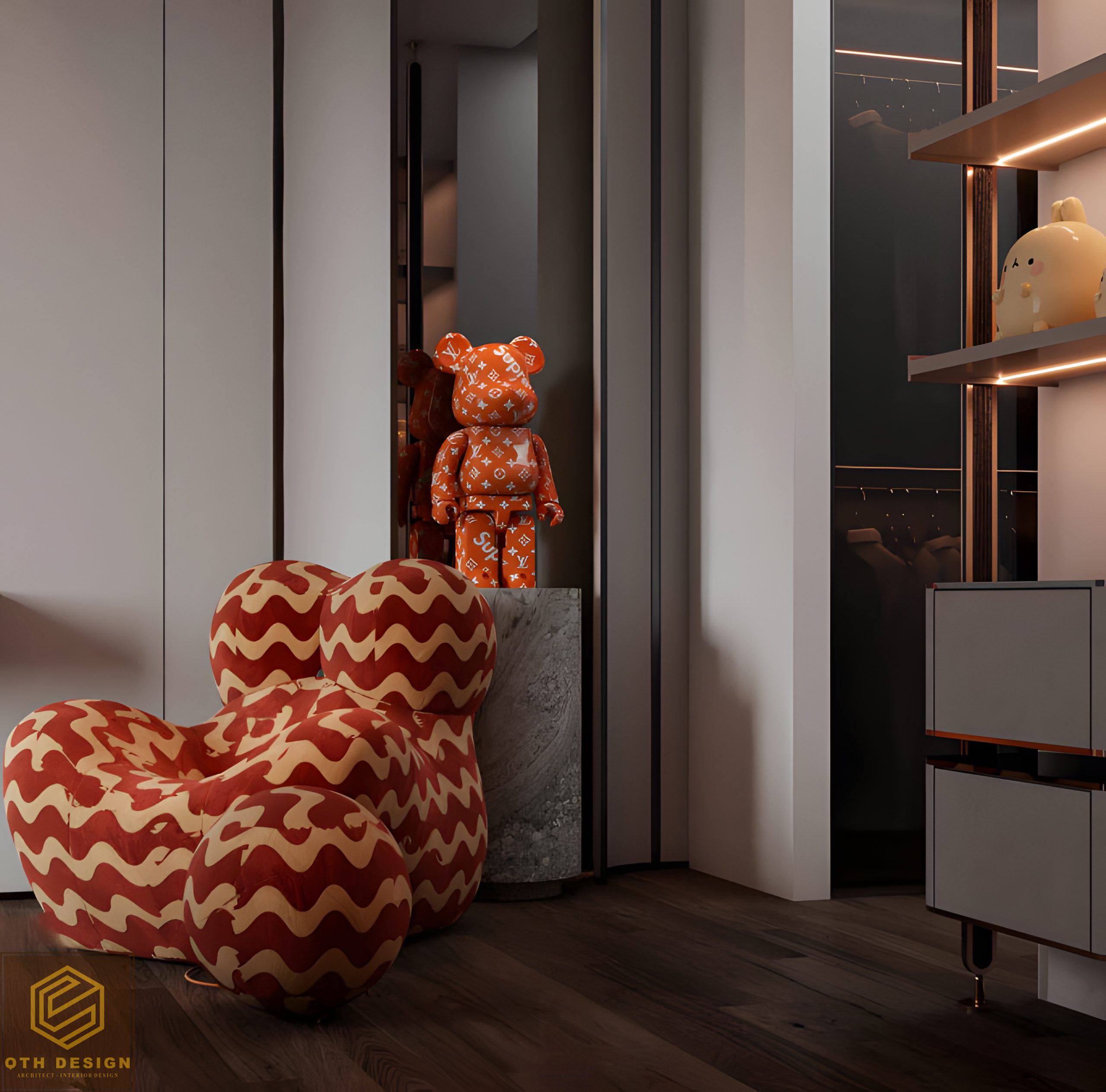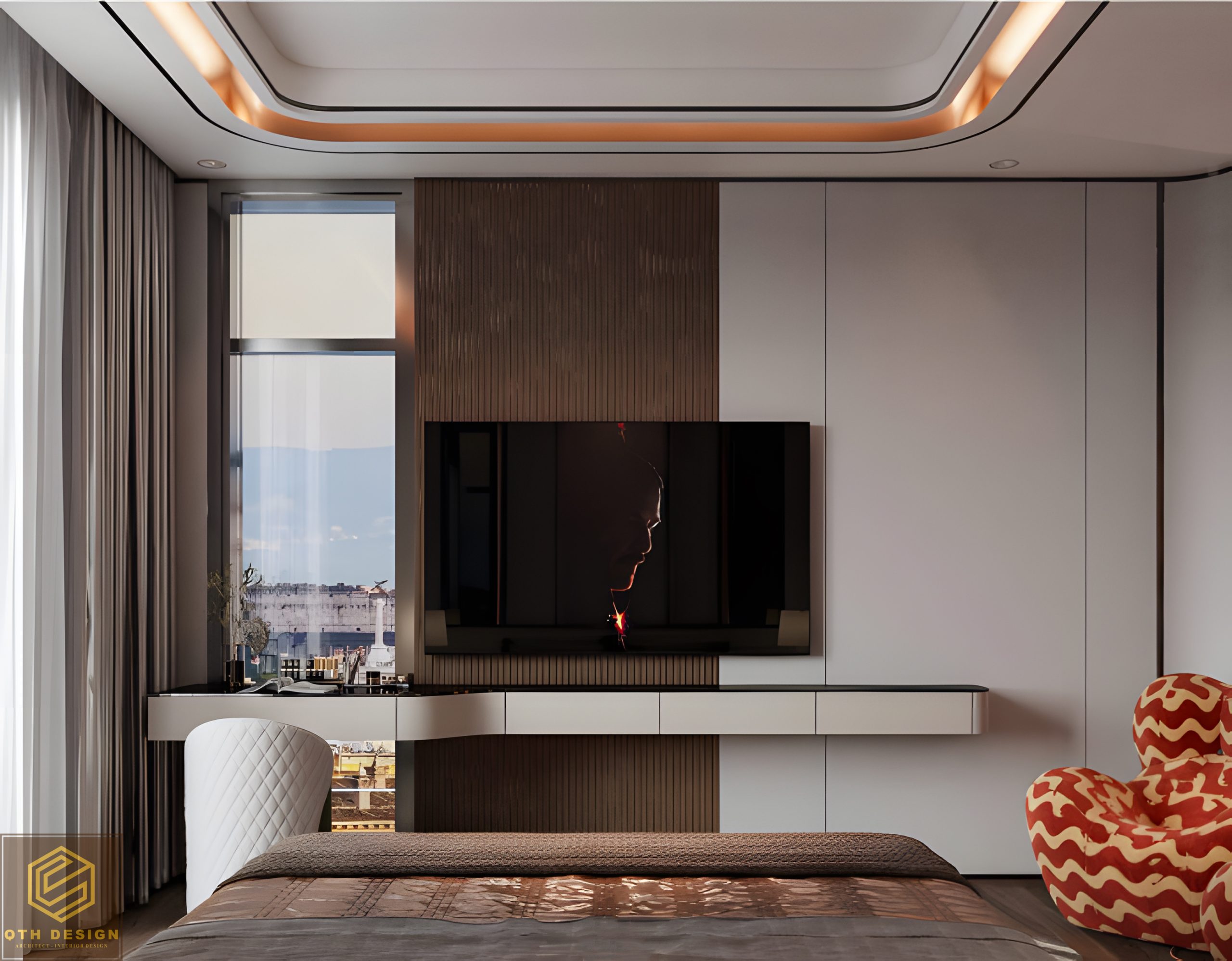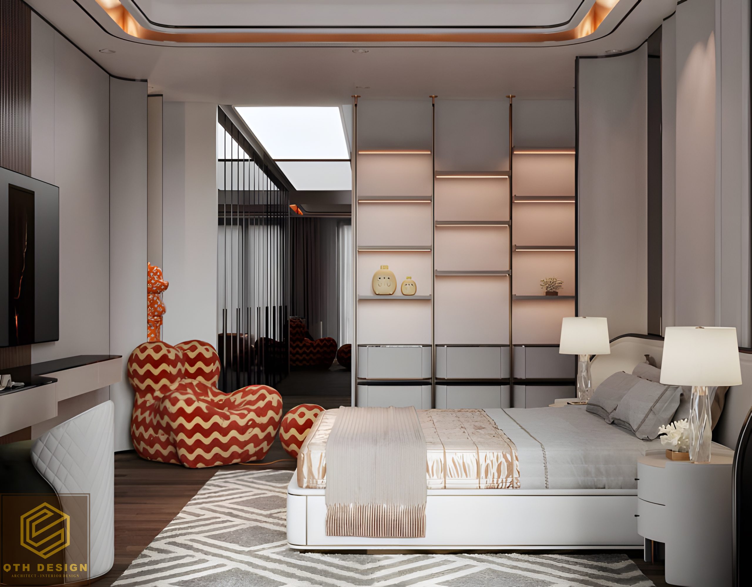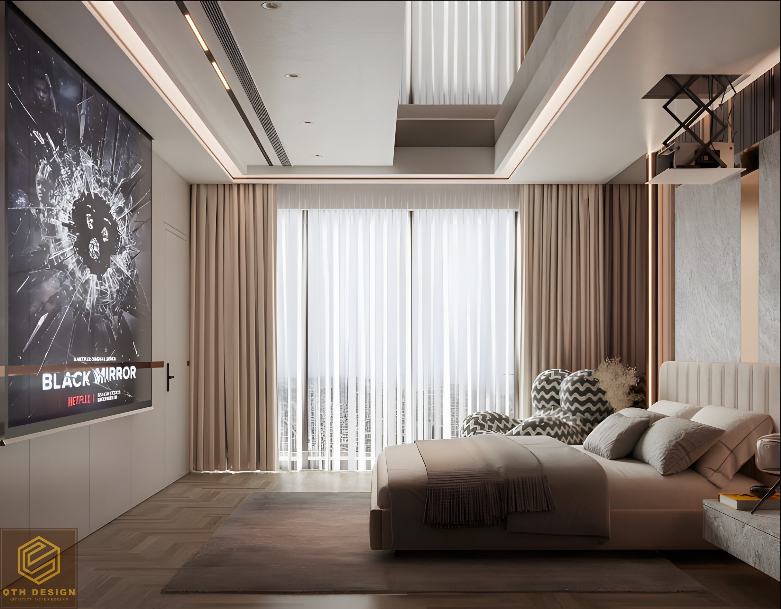 Các phòng ngủ ưu tiên sự tối giản trong đường nét, với gam màu trung tính (xám, be, nâu) làm chủ đạo. Rèm cửa hai lớp đảm bảo vừa lấy sáng vừa tạo sự riêng tư. Hệ tủ âm tường và bàn làm việc/ trang điểm tích hợp tối ưu hóa diện tích. Một số chi tiết như ghế armchair có họa tiết độc đáo hay vách đầu giường ốp đá và gỗ tạo điểm nhấn riêng cho từng phòng.