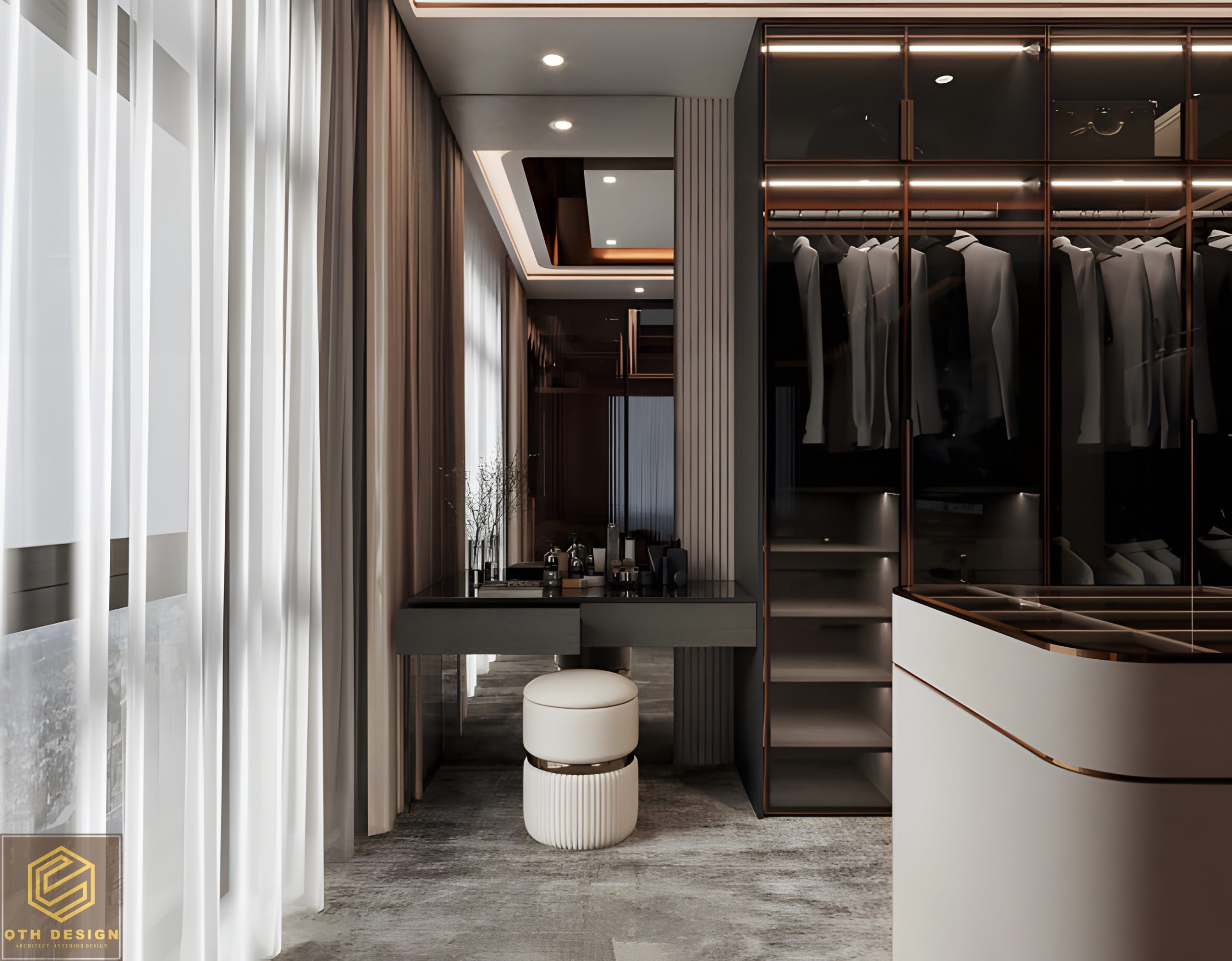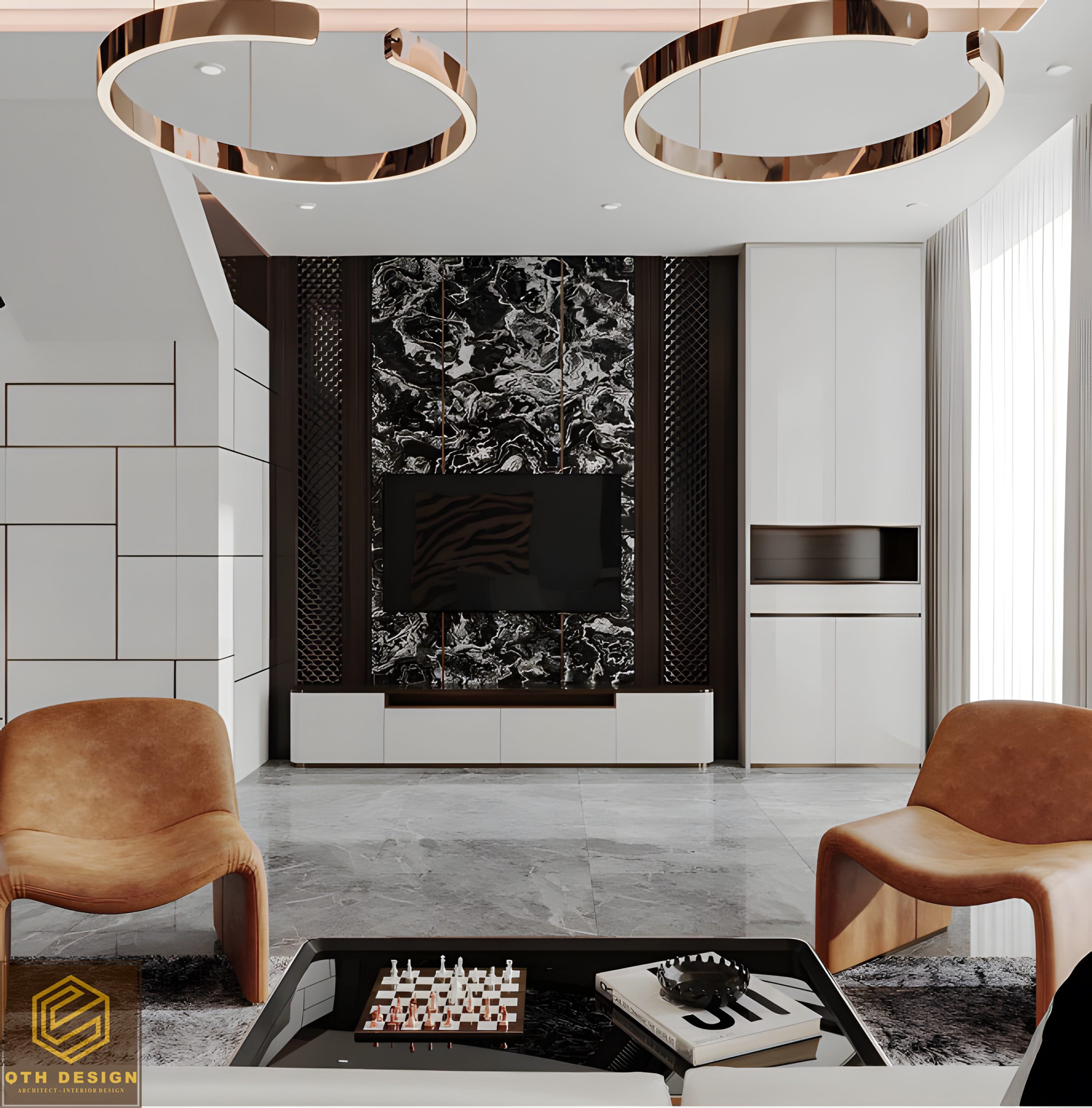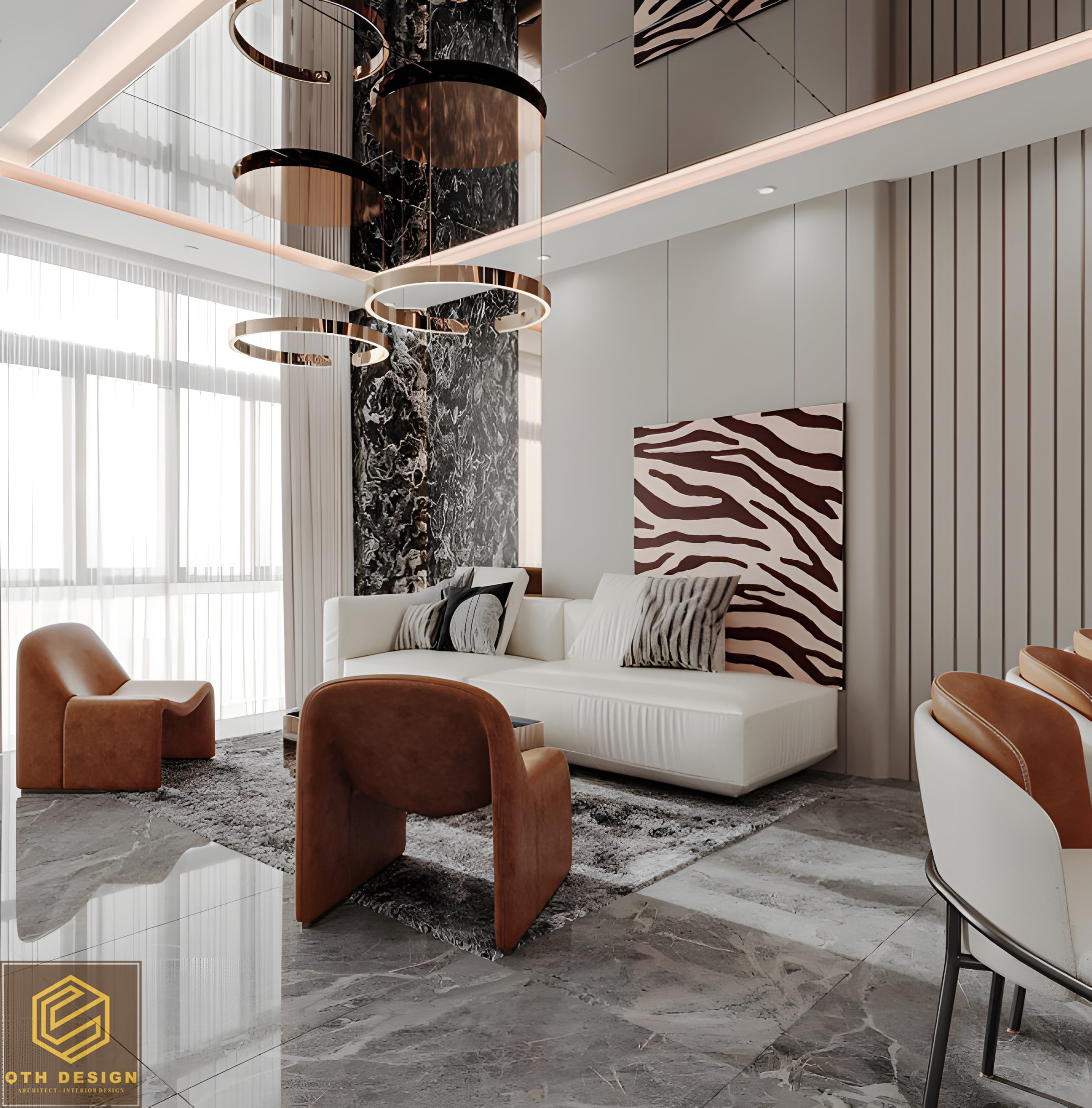 Ánh sáng tự nhiên được tận dụng tối đa thông qua các cửa kính lớn, kết hợp với ánh sáng nhân tạo từ đèn trần, đèn hắt khe và đèn trang trí. Vật liệu cao cấp như kính cường lực, gỗ ốp trần, đá marble, da và nỉ mang lại vẻ sang trọng, bền bỉ.