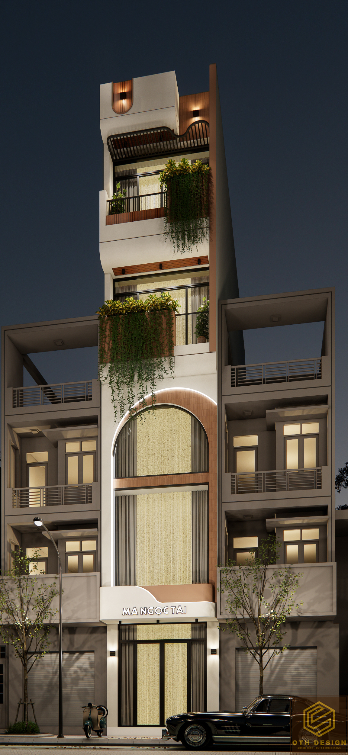 Điểm nổi bật đầu tiên của công trình chính là mặt tiền được chia làm hai phần lộng lẫy: phần trung tâm vươn cao, nổi bật với khối hình học mạnh mẽ và cửa vòm lớn, tạo cảm giác vừa phải thương mại vừa hiện đại; phần hai bên cân bằng tạo sự ổn định và hài hòa cho tổng thể. Cửa sổ lớn ở tầng dưới kết hợp cùng chất liệu kính trong suốt không chỉ giúp lấy độ sáng tối đa mà còn tạo chiều sâu cho công trình.